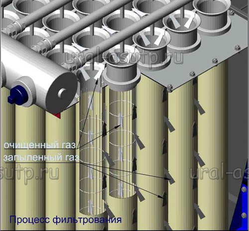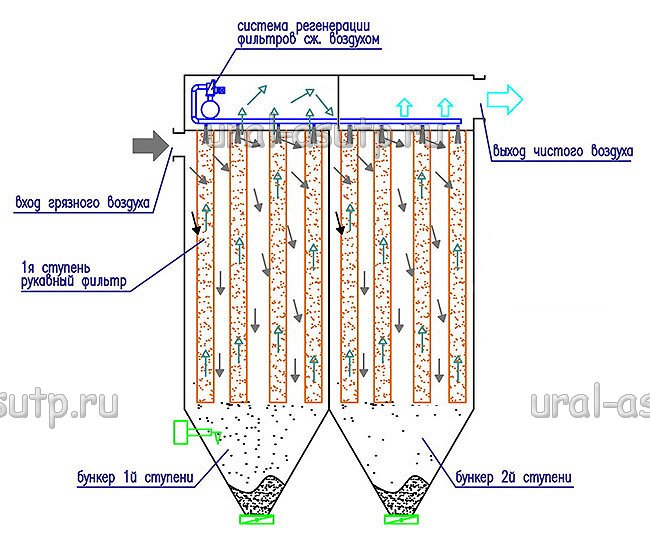 Фильтры рукавные (ФР-И, ФРИ, ФРИП, ФРИК, ФРКИ, ФРКН, СРФ, СМЦ) с импульсной системой регенерации предназначены для очистки воздуха от промышленных выбросов - пылей и аэрозолей. В установках реализован принцип регенерации (очистки) фильтров - продувкой сжатым воздухом. Регенерация фильтра осуществляется подачей импульса сжатого воздуха длительность 0,1-0,2 с, внутрь заблокированного фильтра, фильтр резко расширяется, и «стряхивает» накопившуюся на нем «шубу» в бункер, которая потом удаляется шнеком, при этом происходит продувка фильтровальной ткани в направлении, обратном потоку загрязненного воздуха и фильтр очищается.